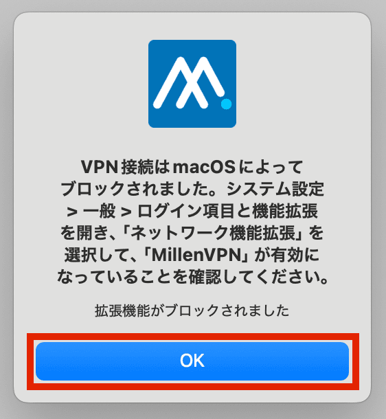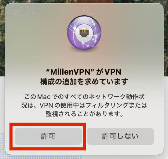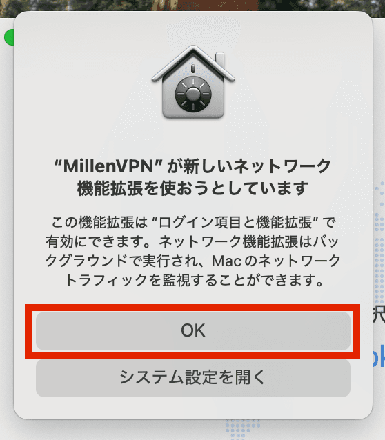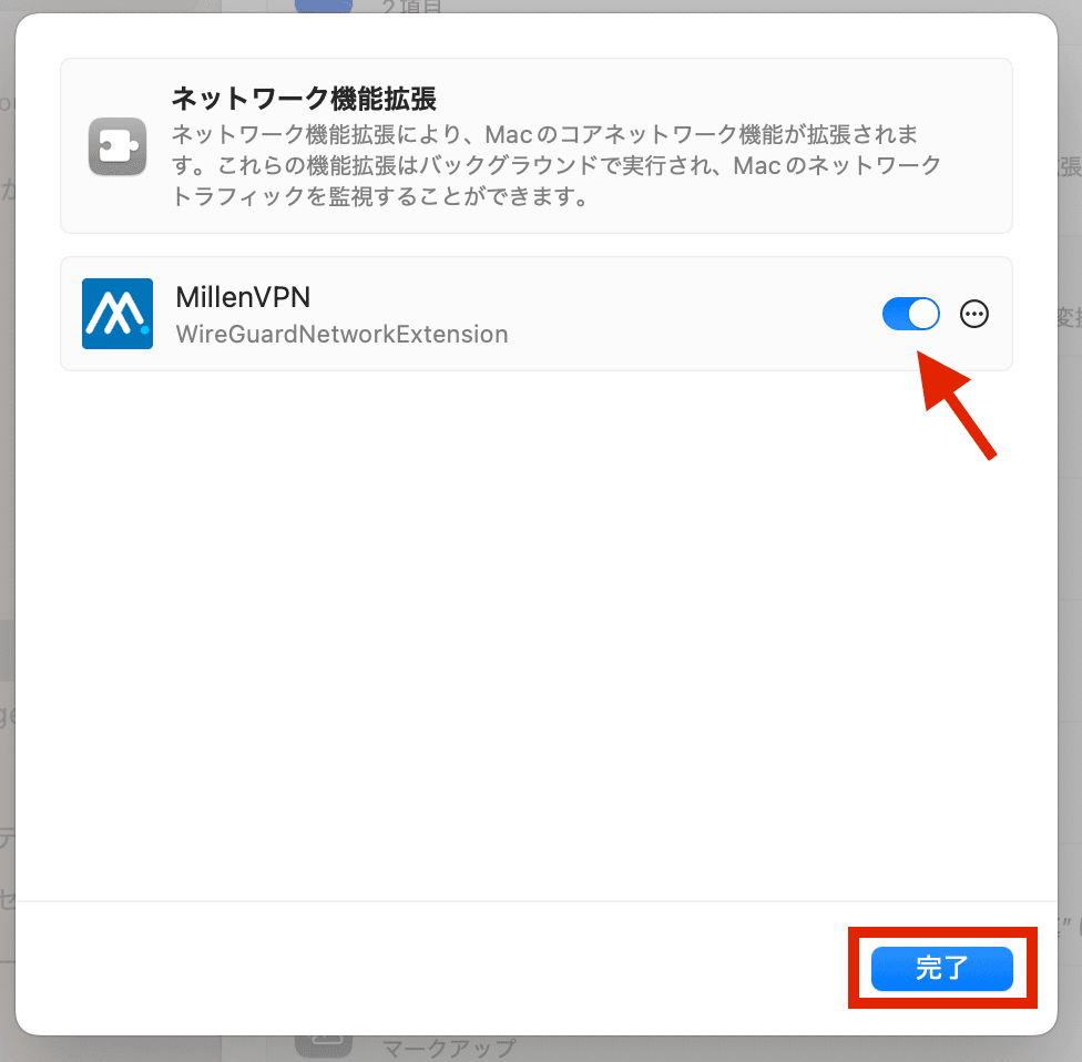 在MillenVPN应用的Mac版本中进行WireGuard连接时,需要启用网络功能扩展。