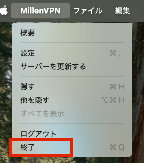 (vii) 在电脑屏幕左上角,点击 MillenVPN > 退出。