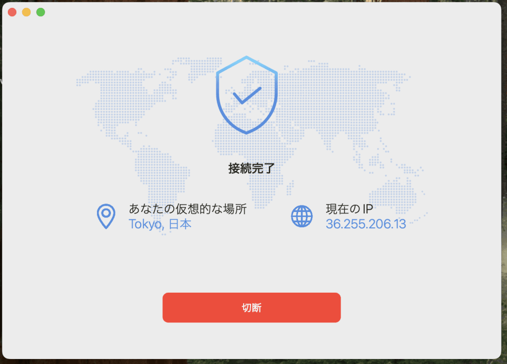 一旦建立连接,就会显示连接的国家和全球 IP 地址。